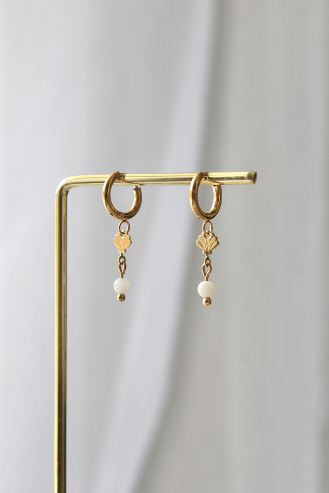 Ces boucles d'oreilles dorées mêlent la finesse d'un coquillage à une perle de coquillage naturelle, pour une touche d'élégance toute en légèreté.