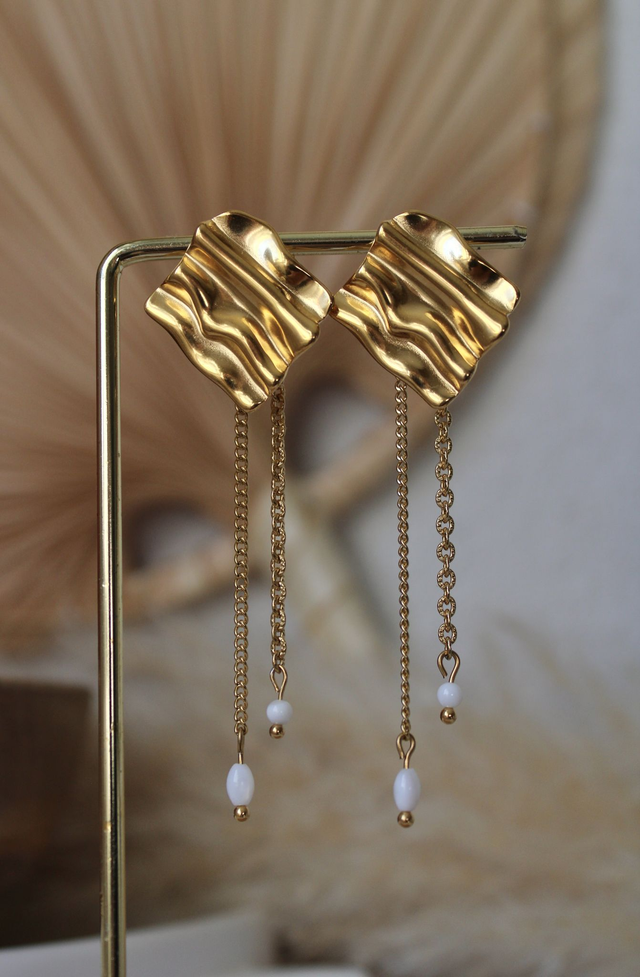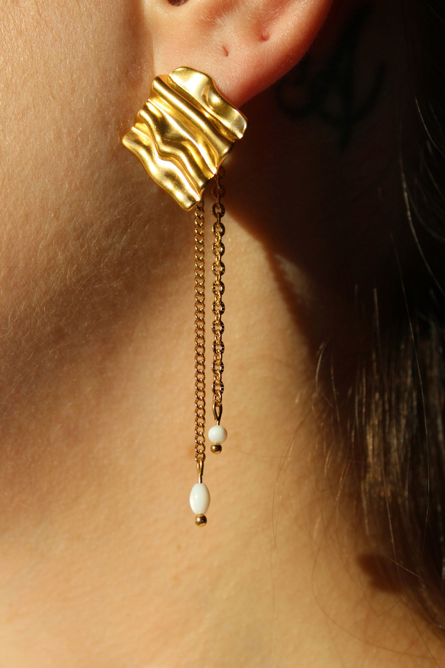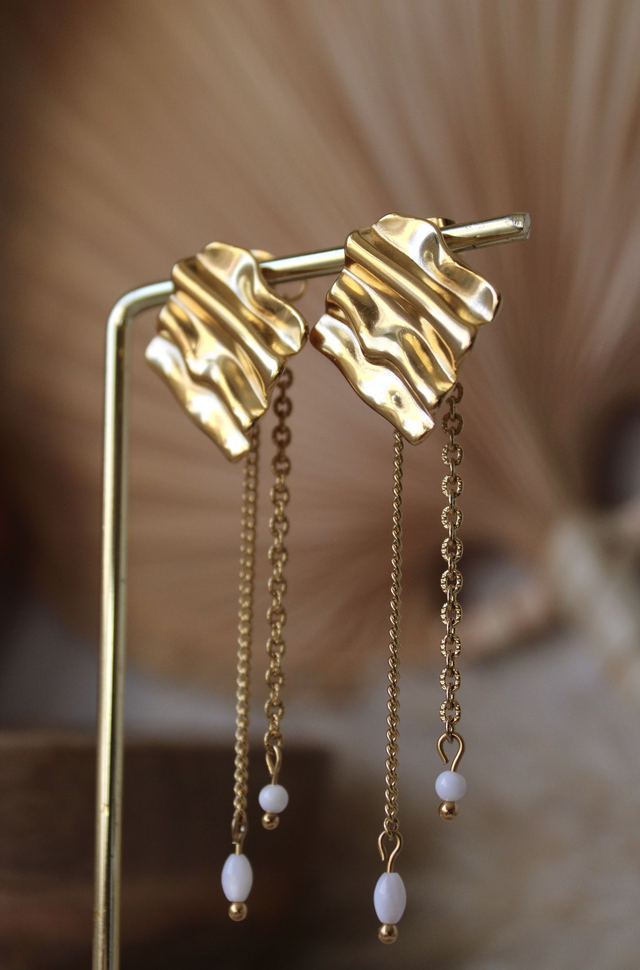 Un design sculptural qui évoque le mouvement fluide des vagues, sublimé par de fines chaînes ornées de perles de coquillage. Onde Nacrée, ce sont des boucles modernes et audacieuses, parfaites pour celles qui aiment affirmer leur style avec une touche unique.