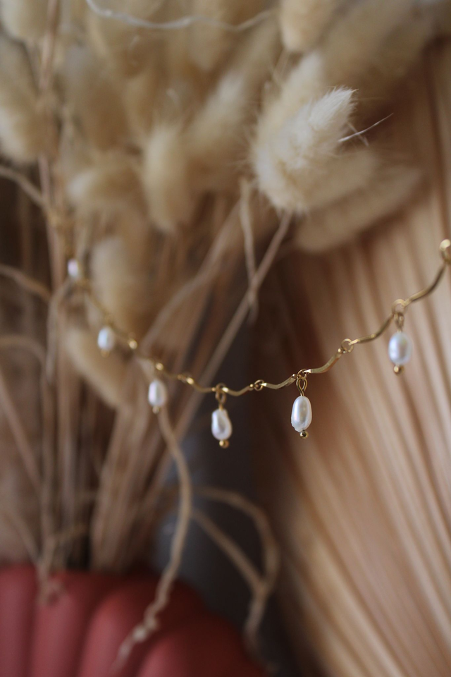 Un bijou délicat inspiré par l'élégance intemporelle de la mer. Avec ses perles d'eau douce suspendues à une maille ondulée, ce bracelet de cheville évoque le doux mouvement des vagues caressant le rivage 🤍