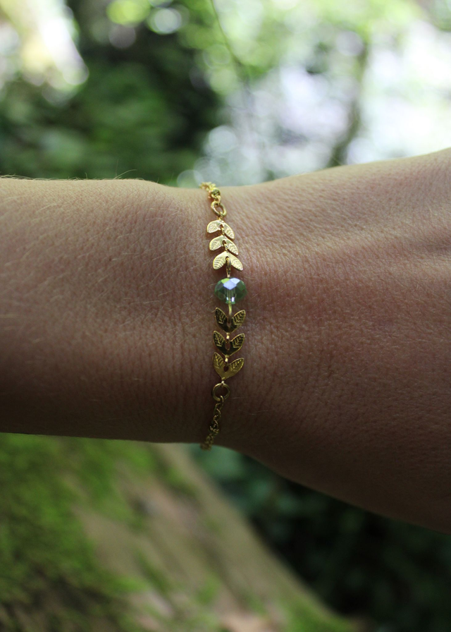 Un bijou empreint de magie, où une perle verte lumineuse trône au centre, entourée de fines feuilles dorées. Il évoque la nature, la sérénité et la douceur des sous-bois enchantés ! ✨