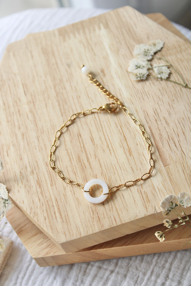 Ce bracelet incarne l'équilibre intérieur et la paix, dans un mélange délicat d'acier doré et de coquillage naturel 🐚