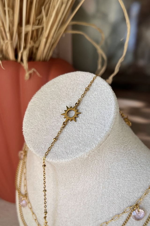 Apportez une touche de lumière à votre poignet avec ce bracelet délicat en acier inoxydable doré. Son pendentif en forme de soleil symbolise l'énergie, la chaleur et la positivité. Fin et élégant, il s'adapte à toutes vos tenues et se porte seul ou en accumulation pour un style raffiné.