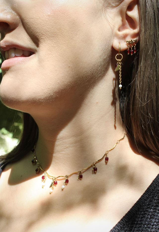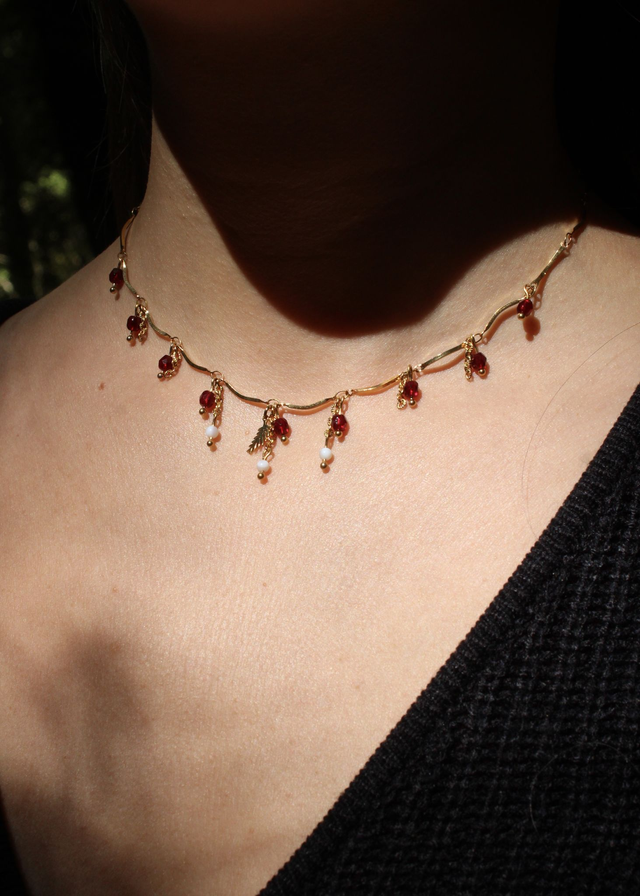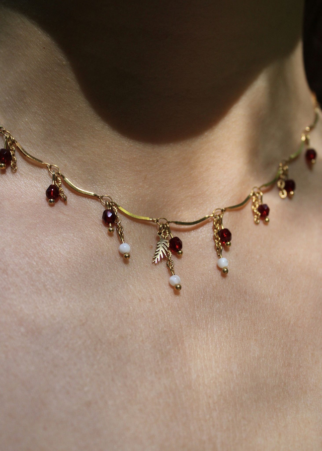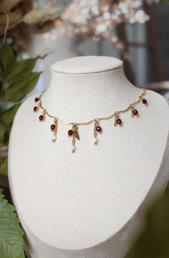 Un ras-de-cou vibrant d’énergie et de douceur. Les perles rouges et nacrées se mêlent à une fine feuille dorée, rappelant la déesse des forêts et des mystères 🌿✨