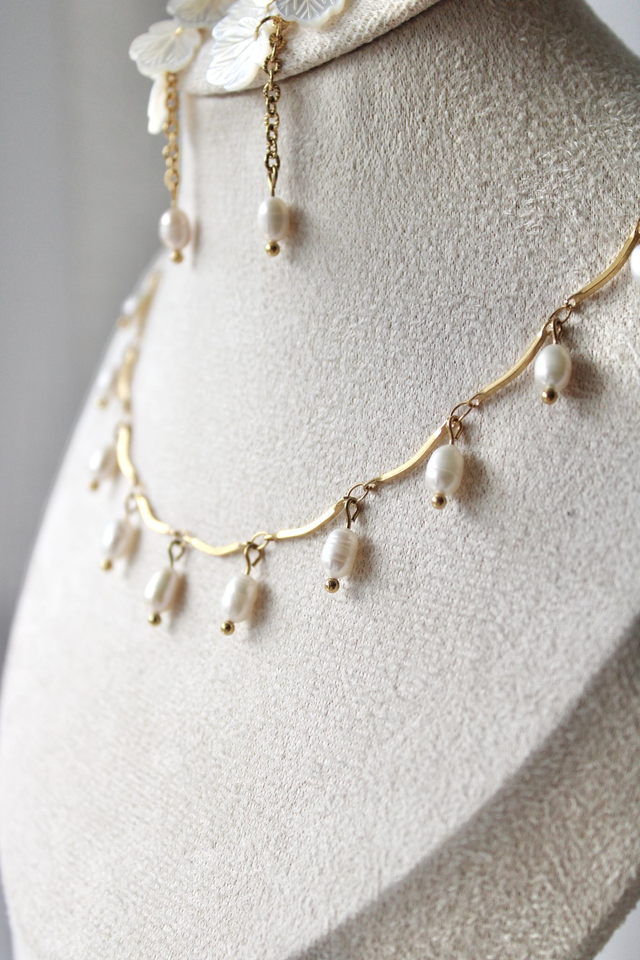 Un ras-de-cou en acier inoxydable, orné de perles d'eau douce tout le long d'une chaîne ondulée et élégante. À lui seul, il évoque la douceur, la grâce et la lumière naturelle ✨