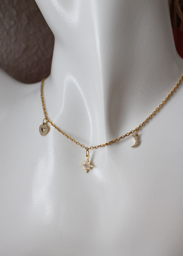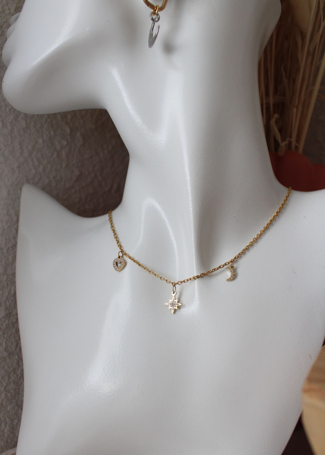 Ses petits charms dorés dessinent une constellation délicate, symbole d’amour et de rêverie.