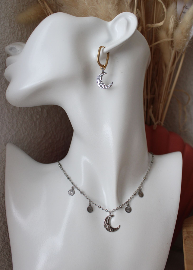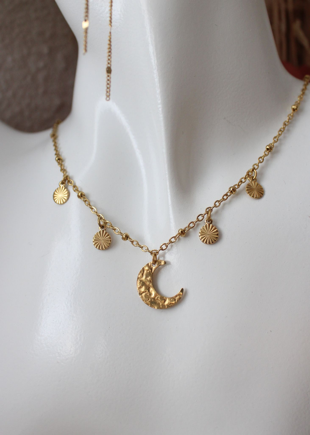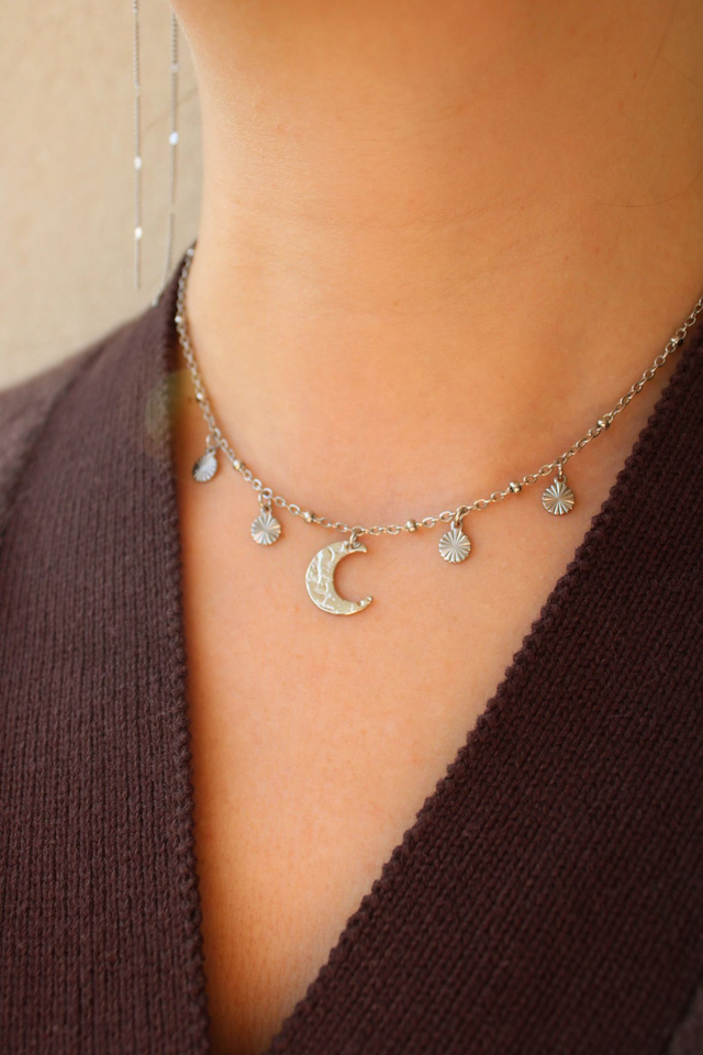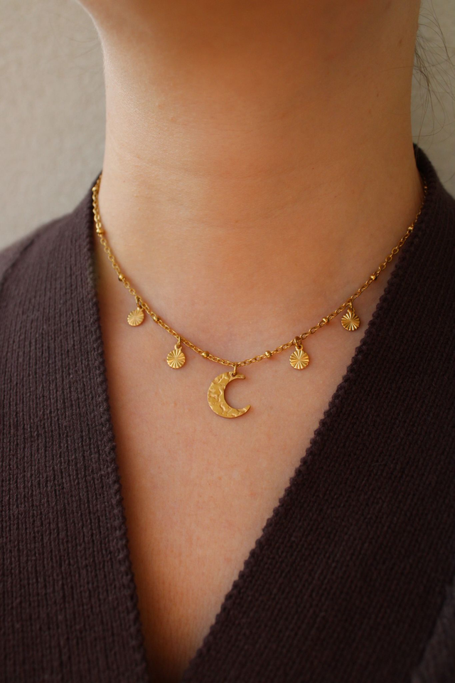Son pendentif lune finement texturé s’accompagne de pampilles solaires, comme un ciel suspendu autour du cou.