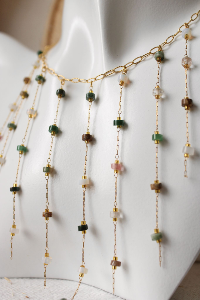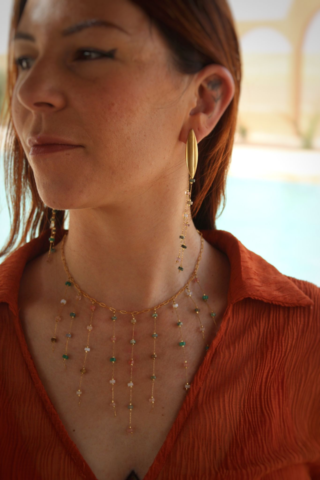 Le collier Esmeralda avec ses chaînes délicates et ses perles naturelles évoquent une pluie d’éclats précieux sur votre peau !