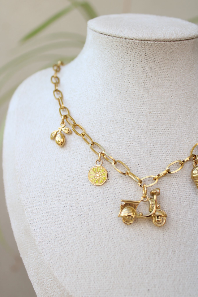 De la douceur de vivre méditerranéenne aux saveurs ensoleillées, ce collier doré célèbre l’art de profiter de chaque instant, à l’italienne. Chaque pendentif incarne une facette de la culture italienne et de ses paysages lumineux.