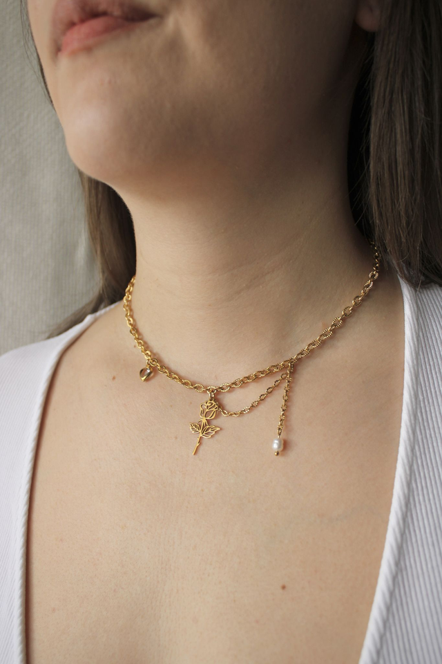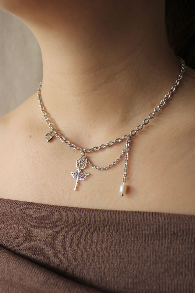Son design asymétrique mêle une rose centrale, un petit cœur discret, et une perle d’eau douce reliée par une chaîne fine.