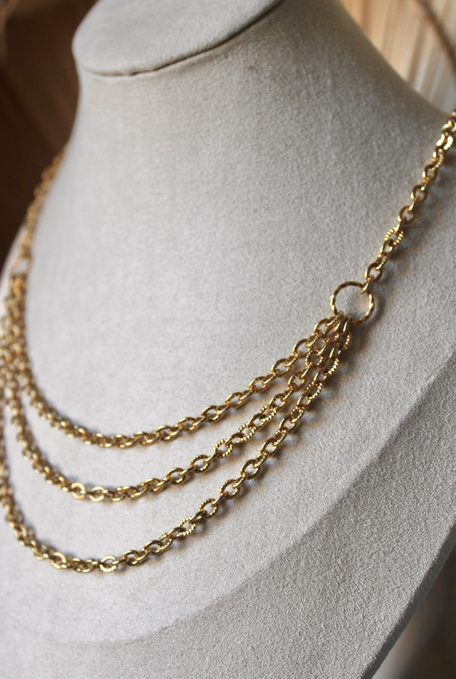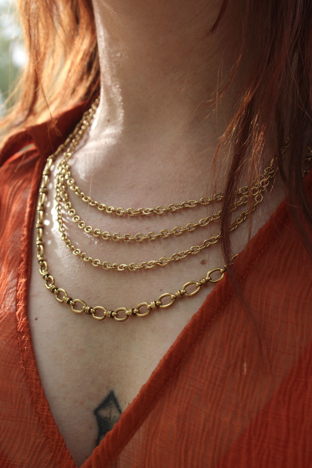 Plongez dans l'élégance intemporelle avec ce collier aux lignes délicates et raffinées. Composé de plusieurs rangs de chaînes entrelacées, il apporte une dimension subtile et harmonieuse à votre tenue. Son design épuré mais travaillé en fait une pièce maîtresse qui sublime aussi bien un look quotidien qu'une tenue plus habillée.