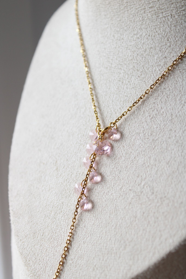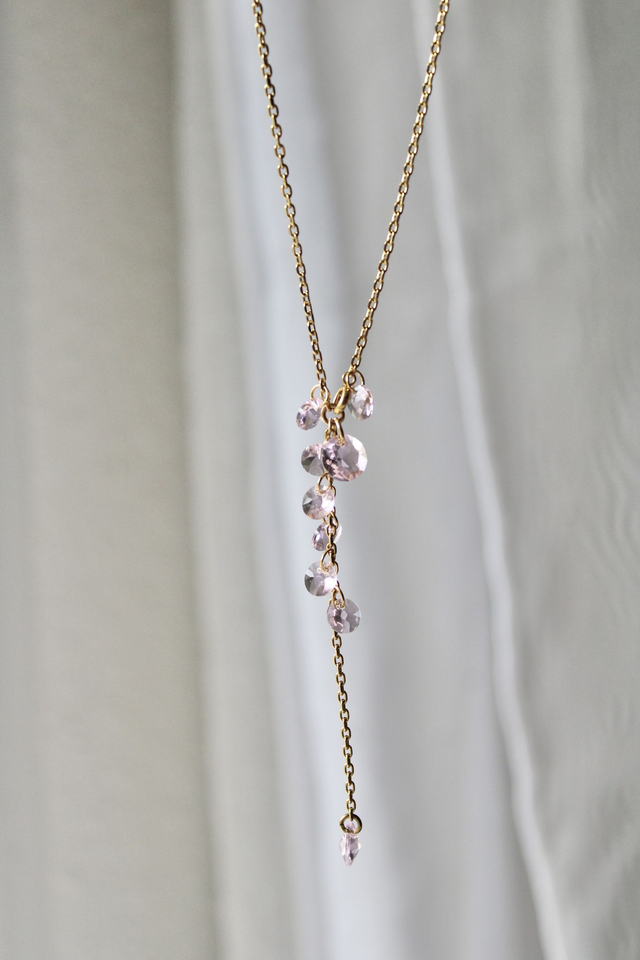 Ses pampilles en verre rose suspendues à une chaîne dorée ajoutent un éclat romantique et lumineux à votre décolleté.