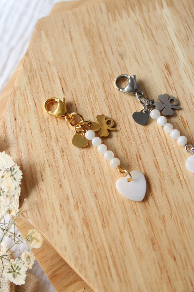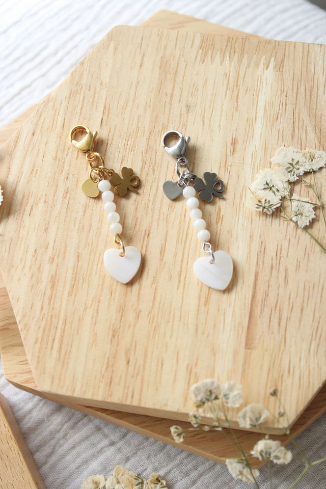 Ce porte-bonheur délicat est composé de perles de coquillage naturelles et d'un cœur en nacre, d'un trèfle à quatre feuilles et d'un petit cœur en métal, comme une douce promesse de chance, d'amour et de protection.